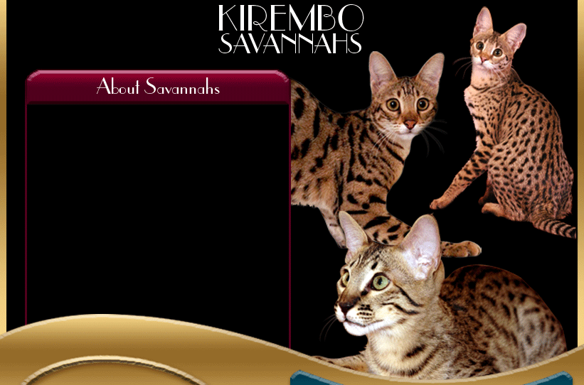 Savannah cats are a new breed that are accepted by The International Cat Association (TICA). Savannahs are a domestic breed originating from initial crosses between the domestic cat and African Serval. The African Serval is a spotted wild cat found in the Savannah grasslands of Africa. The characteristics that make it attractive as an ancestor to this breed are its exotic spotting, its long and lean body, large upstanding ears, exotic face, energy, and personality (sociable, curious, and interactive). The goal of this breed is to produce a domestic cat with the exotic appearance of the African Serval, with a unique personality derived from the Serval while retaining all relevant domestic cat traits. Savannahs eat domestic cat food (although often preferring a raw diet), faithfully use litterboxes and basically live in your house like any other domestic cat. They may differ in many ways: come when called, fetch toys for hours, go for walks outside on a leash, jump in your bathtub when full of water, insist on showering with you in the morning, and usually are very "helpful" in the kitchen. And, of course, their looks are different: their huge ears, the different shaped eyes, the spots, their walk... Development of the breed is complicated by a fertility issue: males of the first four generations (approximately) are sterile, but females of all generations can be expected to be fertile. To develop the breed, males from selected outcross breeds (and mixtures of these breeds) are used, and now fifth generation Savannah males are becoming available to be used in breeding future Savannahs! Servals are amazing creatures, and people are often tempted to get one of their own. They are cute and lovable when kittens, but their mischieviousness and lightning reactivity when full grown animals can make them difficult to live with. We must remember that Servals are still wild animals and need special facilities, nutrition, handling, and attention. It is the hope and goal of the Savannah breeder to give people an alternative to the wild cat, that still fulfills the yearning to have such an exotic-looking cat. Savannahs are Expensive! My favorite way to describe the cost of a Savannah is to liken it to flying you and your favorite companion to Paris (from San Francisco in my case) for a week in May staying at a 3 star hotel (minimum). Of course, you get to have the Savannah for years so it is a much better value. This cost is due mainly to the complicated process that goes into making our breed. There is more information on why this breed is so expensive on the FAQ page. |