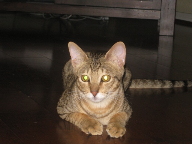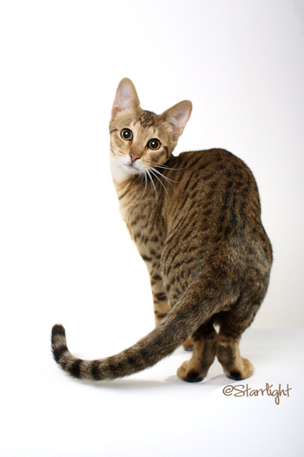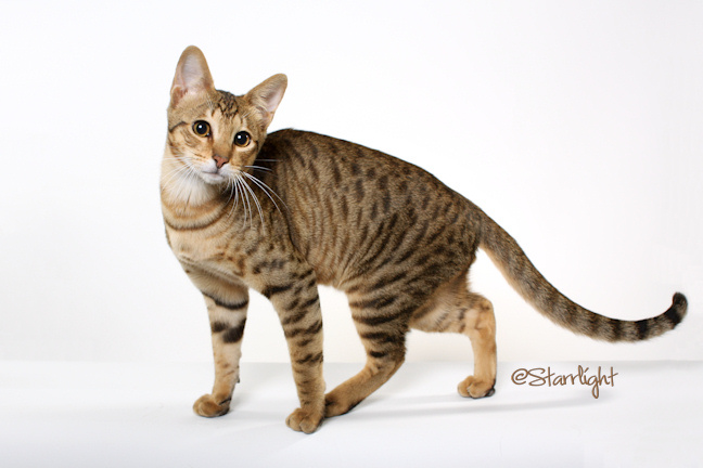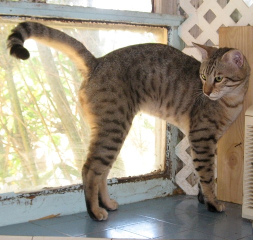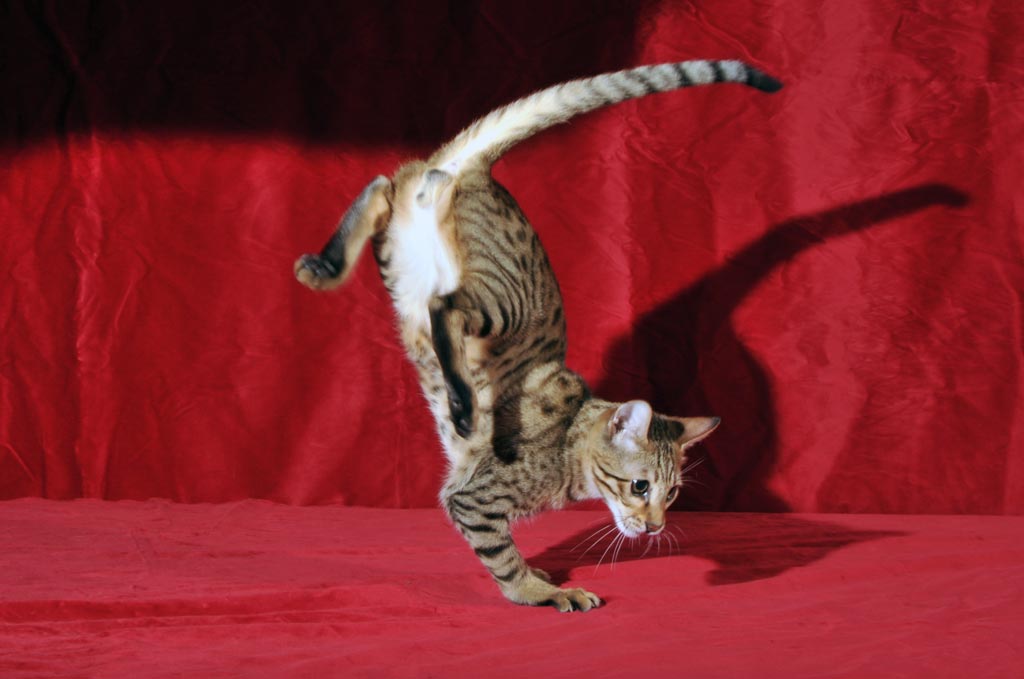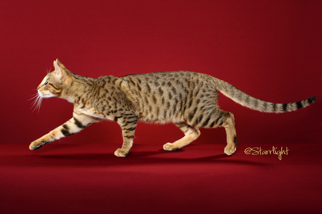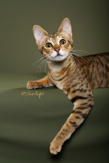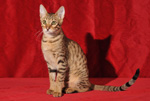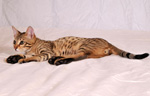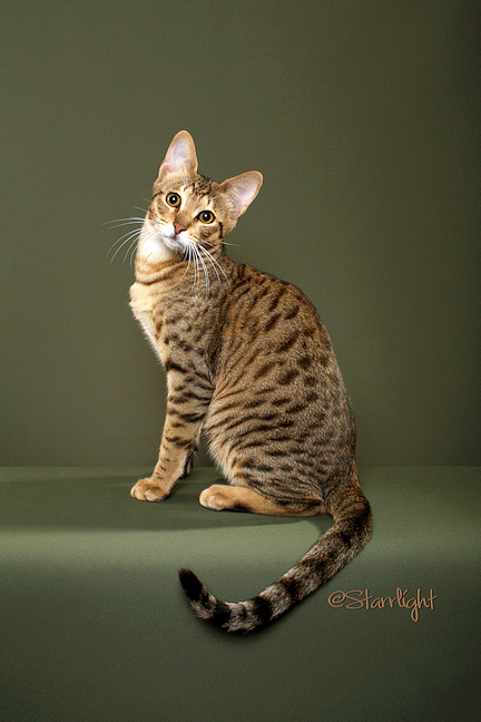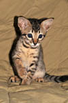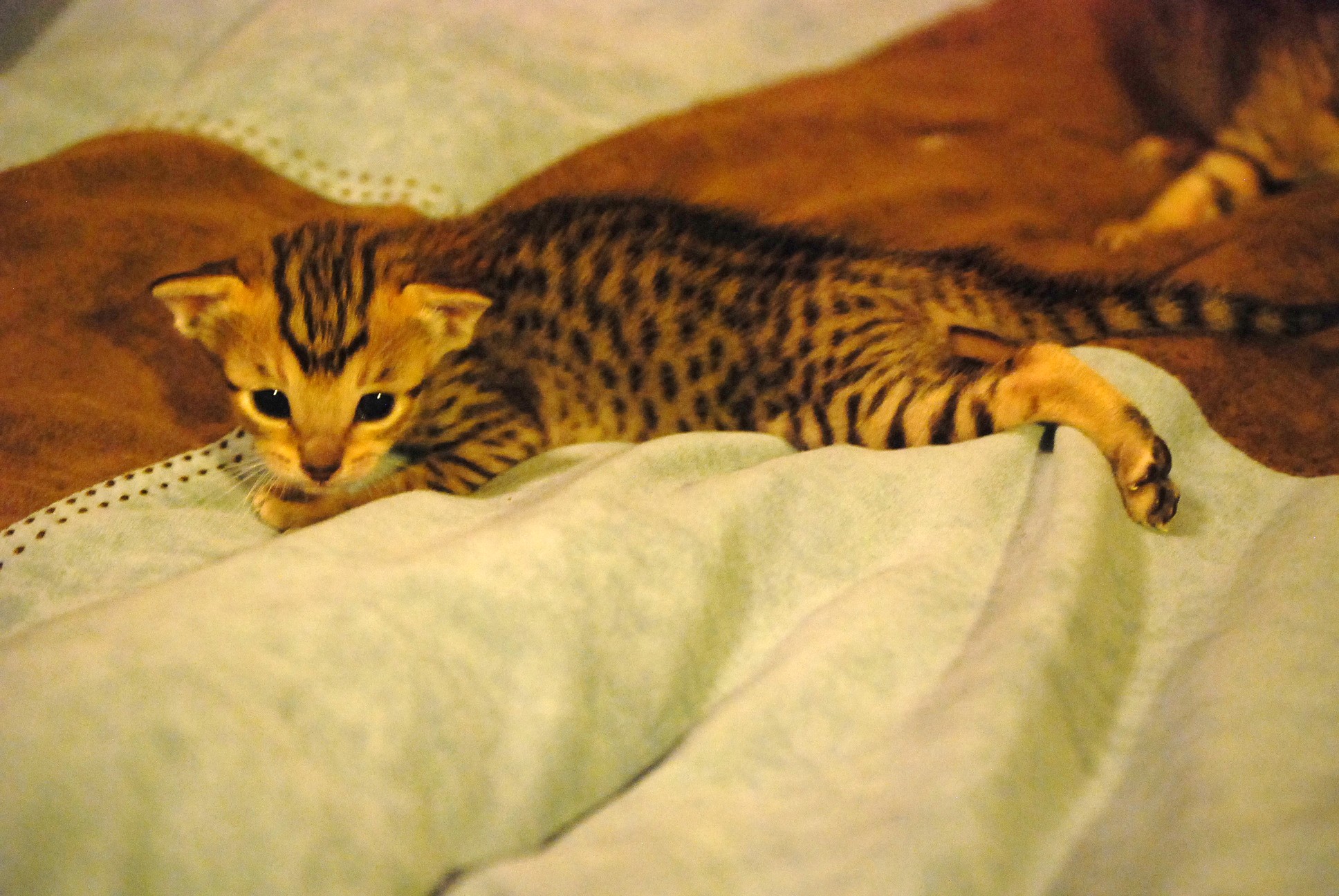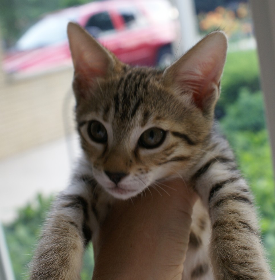 Kal Kal is a homegrown stud out of Essie and Kashka (see on Retired Cats page), we share him with our sister cattery Gattobello Savannahs . Kal is a sweet boy that we had to wait some time to see kittens from, we'd almost given up on him at 2 and a half years of age but the kittens he produced with Kristine's F2 girl Rio were worth the wait. Kal has a great face shape, with good ears and a nice substantial body. Carrying Kashka's genes has made him valuable to our programs and we look forward to seeing what he produces for us. |