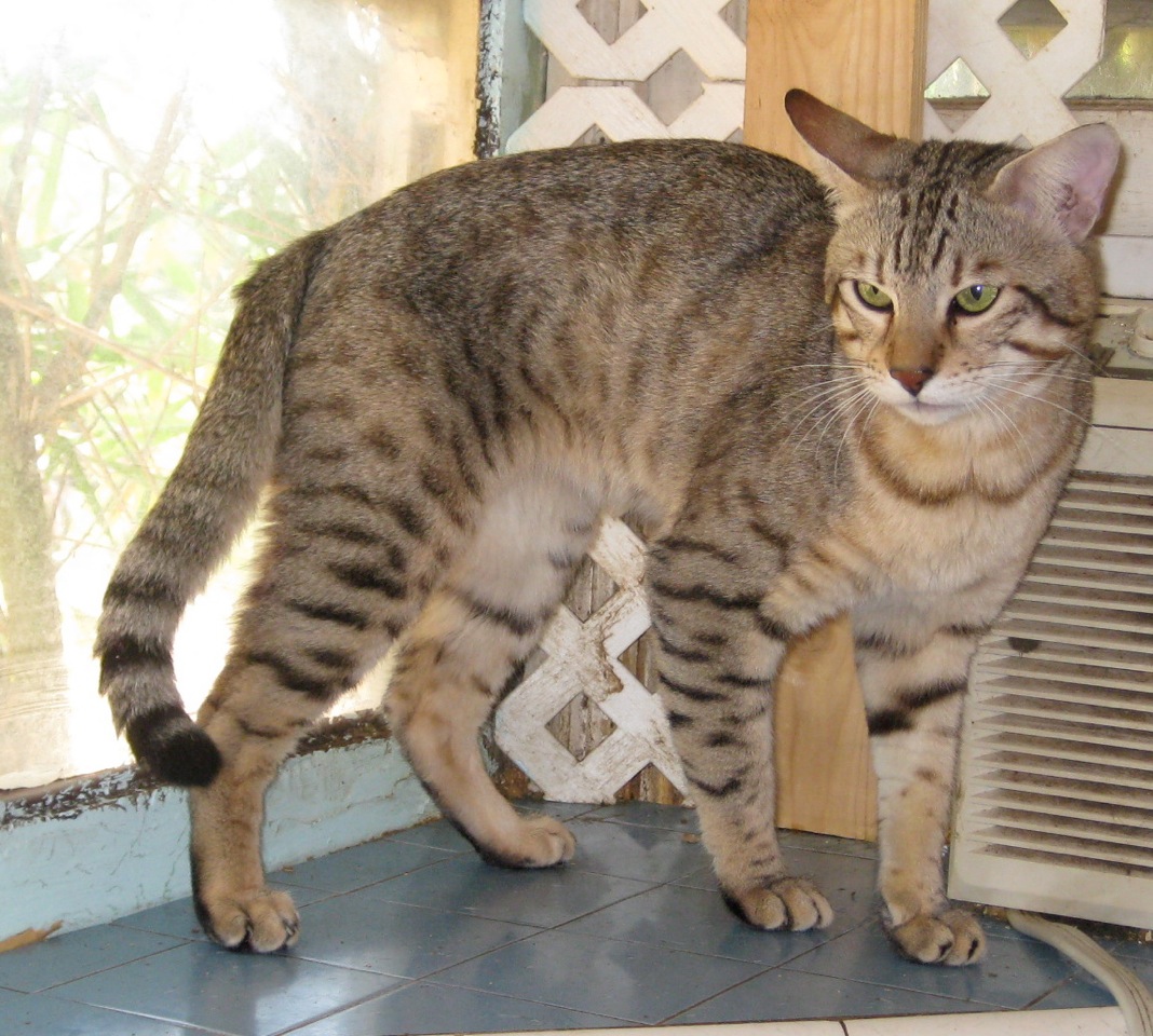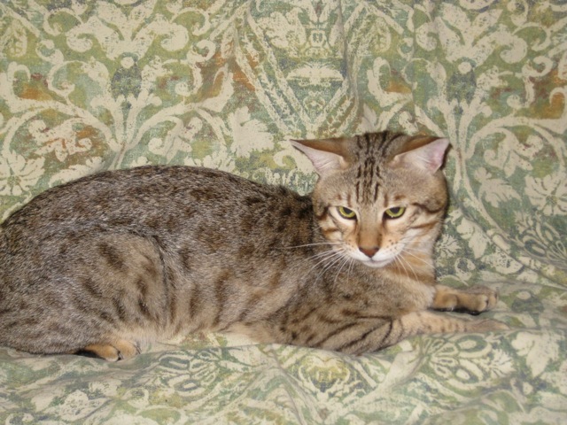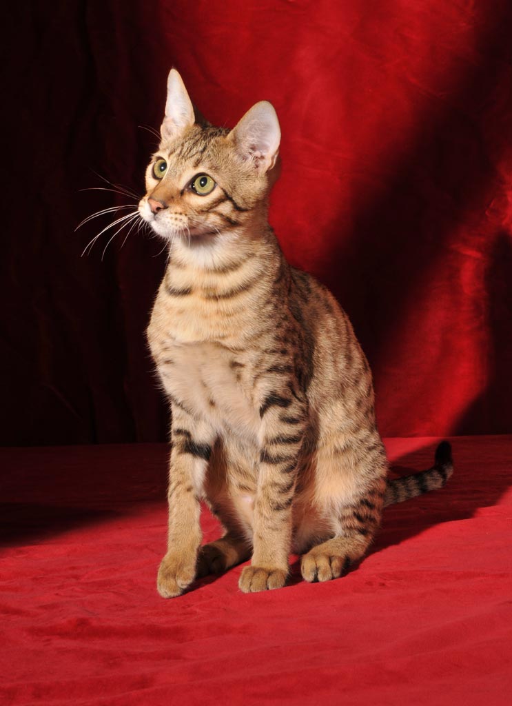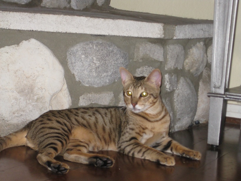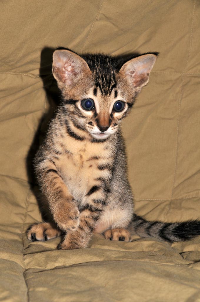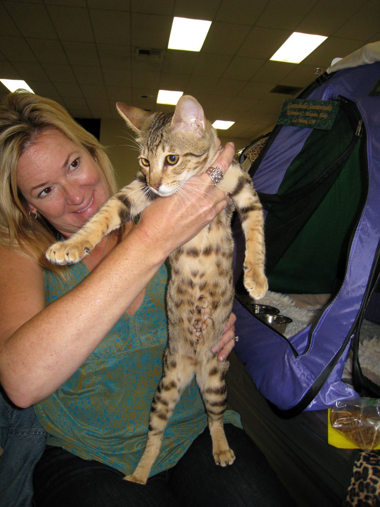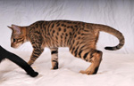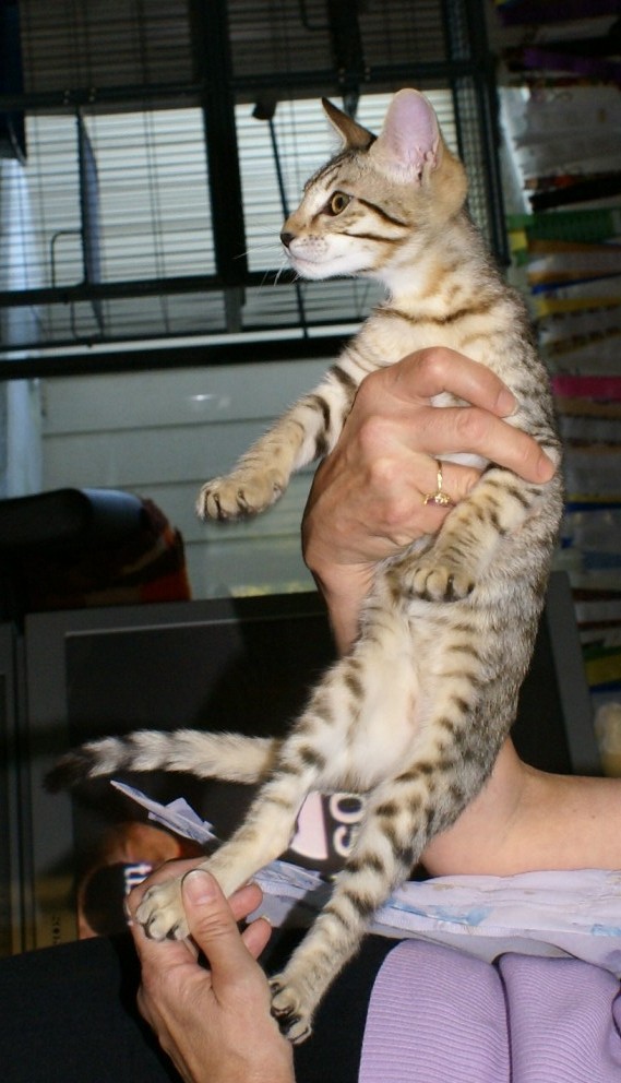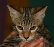 Brazzi Brazzi is an SBT Savannah, which means that there are only Savannahs in his three generation pedigree, this is what is considered a "purebred" by our cat registry TICA (the International Cat Association, www.tica.org). Brazzi is coowned with our sister cattery Gattobello Savannahs . Brazzi has developed nicely...he has a lovely small eye and generous nose leather, his body is nicely proportioned and he showed decent ears before his stud jowls ruined his look. Brazzi is a super-sweet cat, which makes us so happy as we (both Kristine and I) feel that temperament is an important part of the Savannah breed. |
