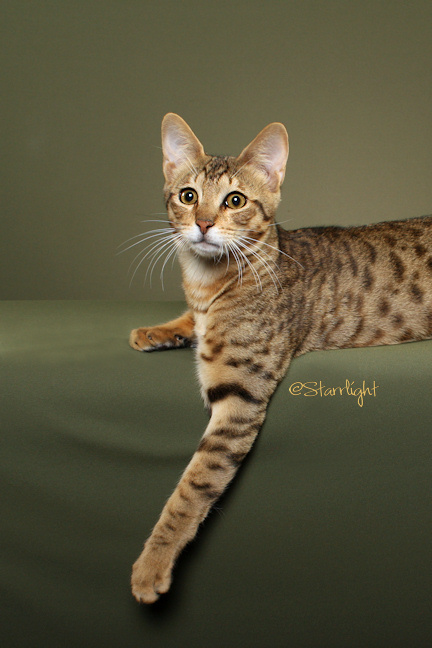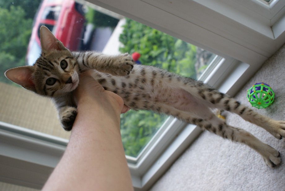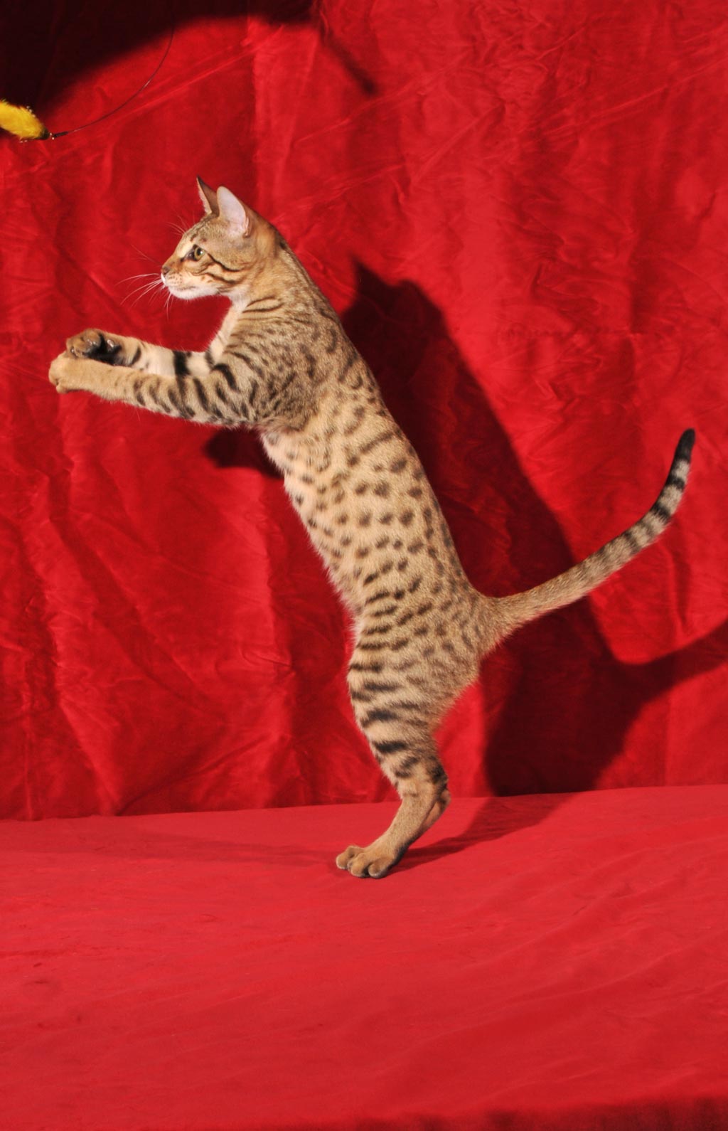 Dino Dino is an SBT Savannah, he has become a valuable stud for us and our sister cattery Gattobello Savannahs . Dino has a lot of good qualities to contribute to a program. He's grown well and has a lovely warm tone to his coat. His nose is really nice and puffy and his face shape is good. He's got a rangy build to his body and a nice profile. He's a super-exceedingly sweet boy bordering on obnoxiously needy for love and affection...from people or animals. He has been producing wonderful kittens with great Savannah type but also amazing loving personalities. |