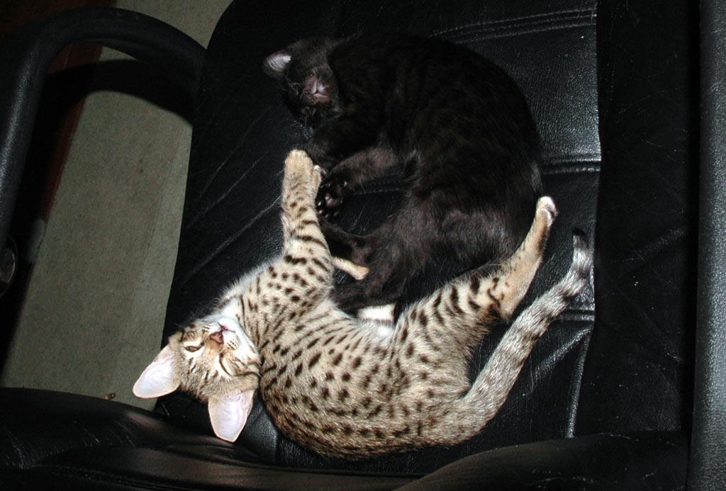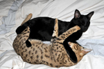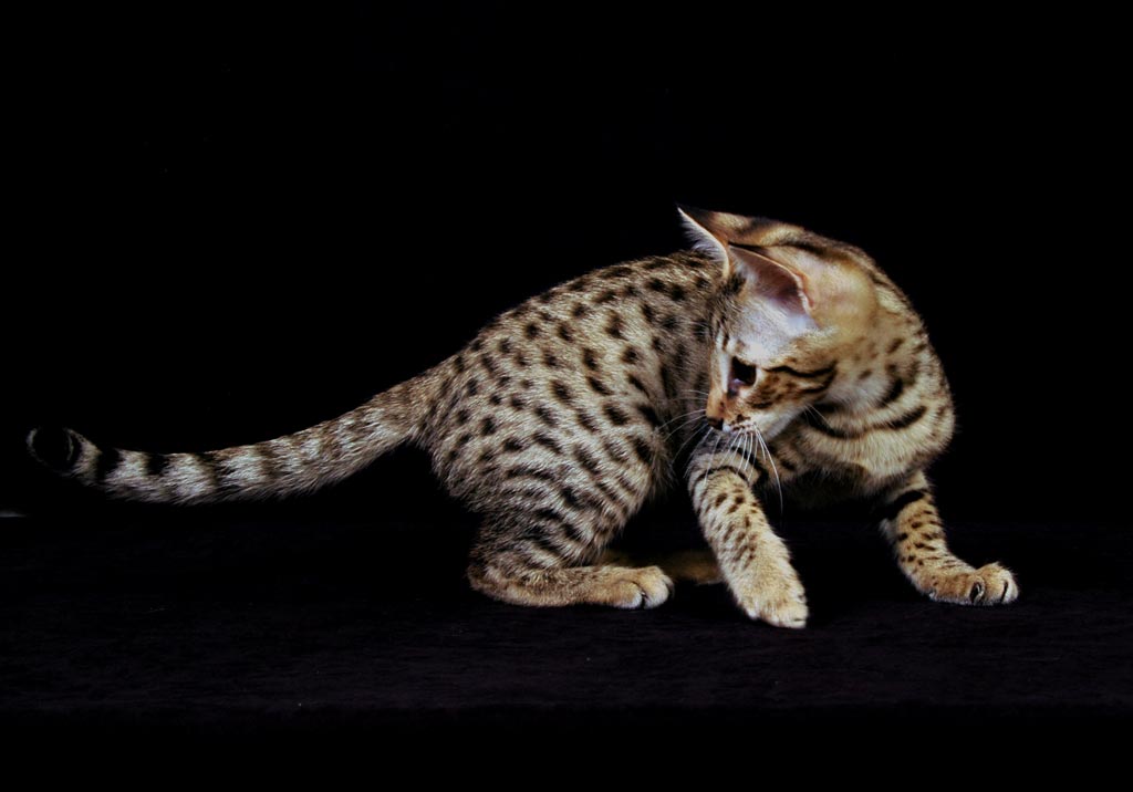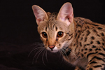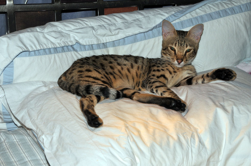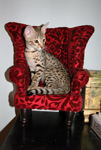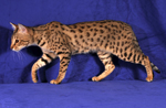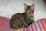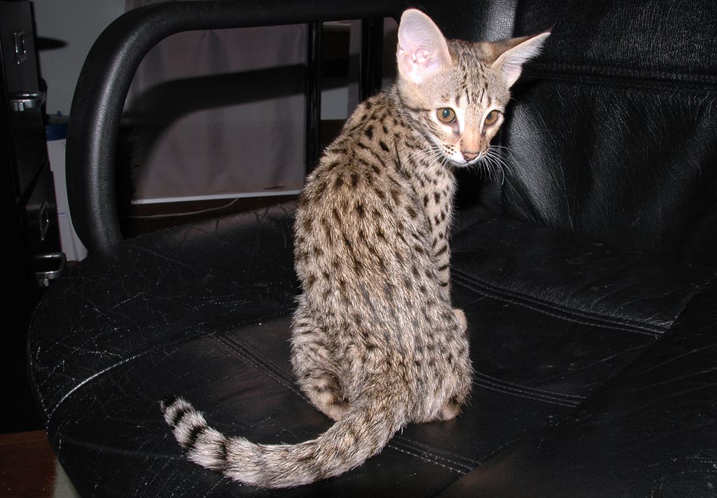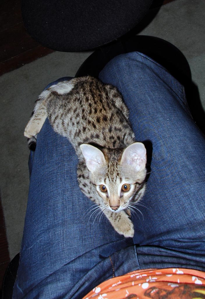 Tisha is my favorite kitten produced here ever, it broke my heart to let her leave here. This was for her, not me, and my heart still aches for my little princess. She is very lucky to have found such a great new owner... and I have every expectations she is ruling that home and Dukie too! I will be delighted if I can produce more kittens with Tisha's type, to me she is as wonderful and says "Serval in a domestic package". No Savannah is perfect of course, but some excite us more when they come along... |